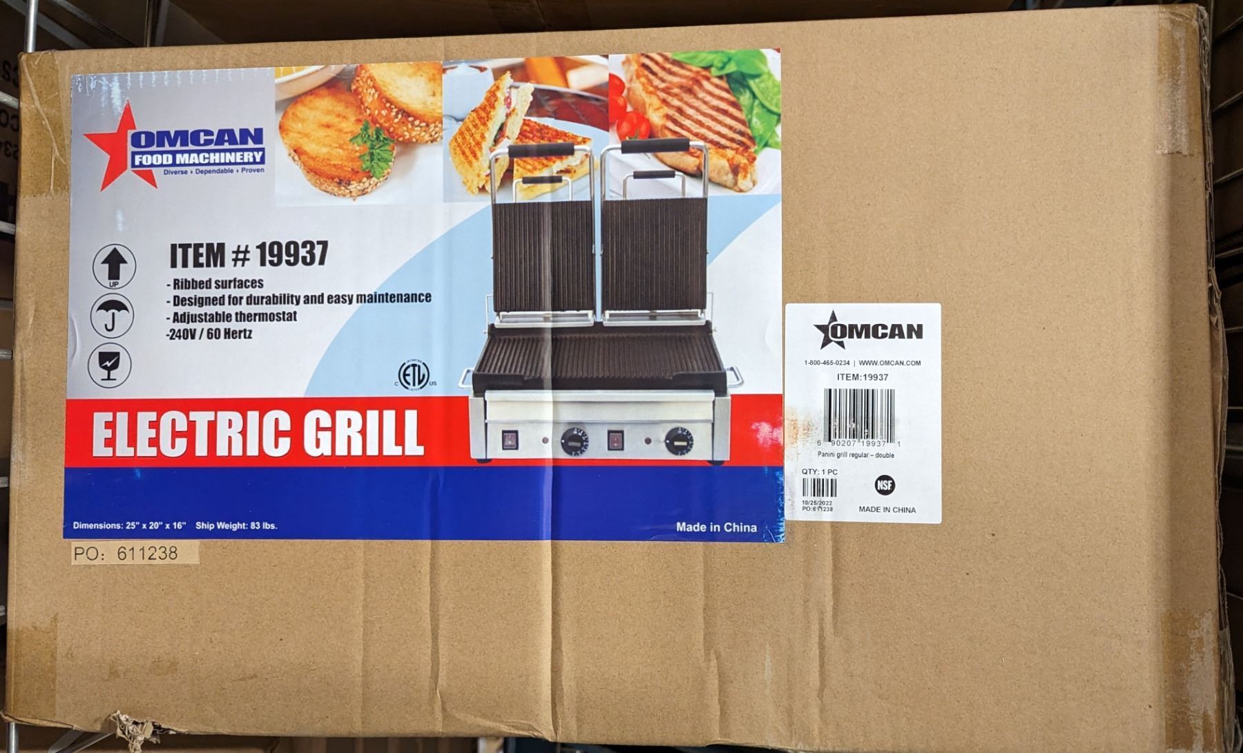 [New In Box,] Grill Surface: 10" x 18", Thermostat Control: 570° F, Power: 3.2kW, Electrical: 220/60Hz/1Ph, Top Grill Surface: Grooved, Bottom Grill Surface: Grooved, Dimensions: 36" x 24" x 47", Weight: 85 lbs