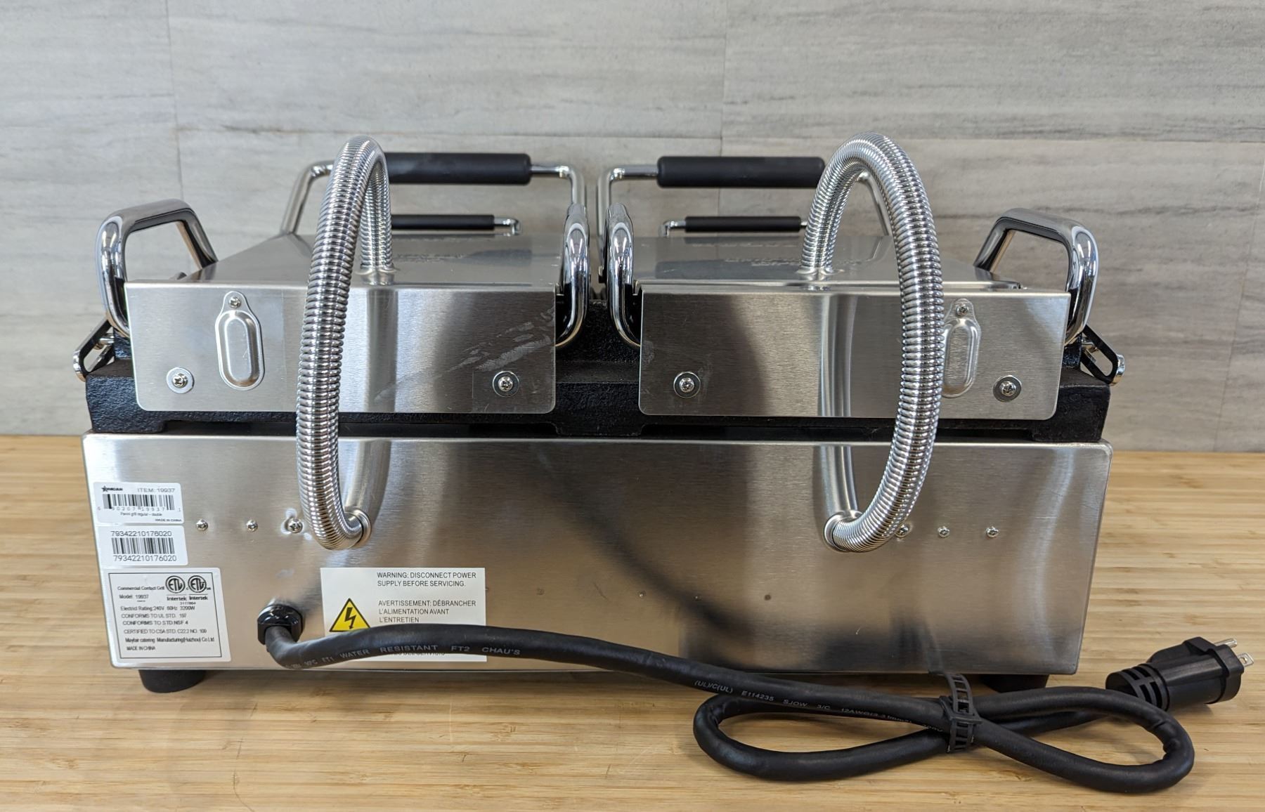 [New In Box,] Grill Surface: 10" x 18", Thermostat Control: 570° F, Power: 3.2kW, Electrical: 220/60Hz/1Ph, Top Grill Surface: Grooved, Bottom Grill Surface: Grooved, Dimensions: 36" x 24" x 47", Weight: 85 lbs