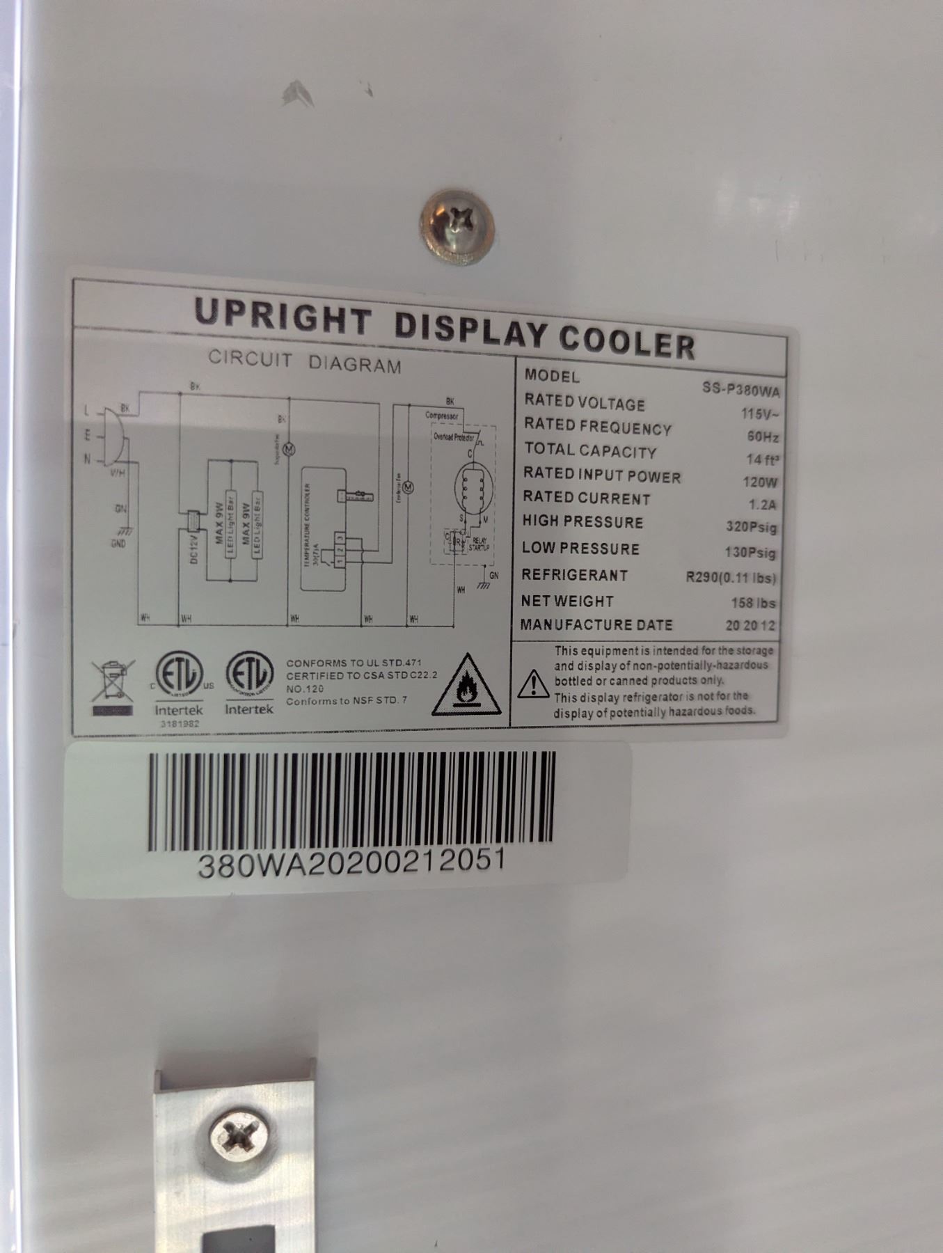 [Used, Tested/Working,] Serial# 380WA20200212051, Model: SS-P380WA, 24" x 23" x 77", 115V/60Hz/1Ph
