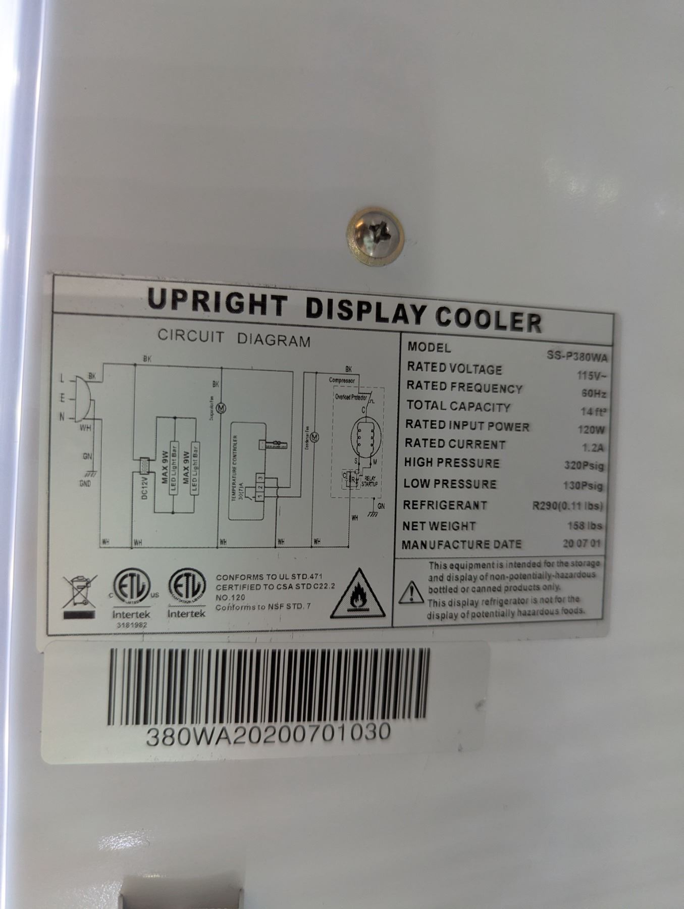 [Used, Tested/Working,] Serial# 380WA20200701030, Model: SS-P380WA, 24" x 23" x 77", 115V/60Hz/1Ph