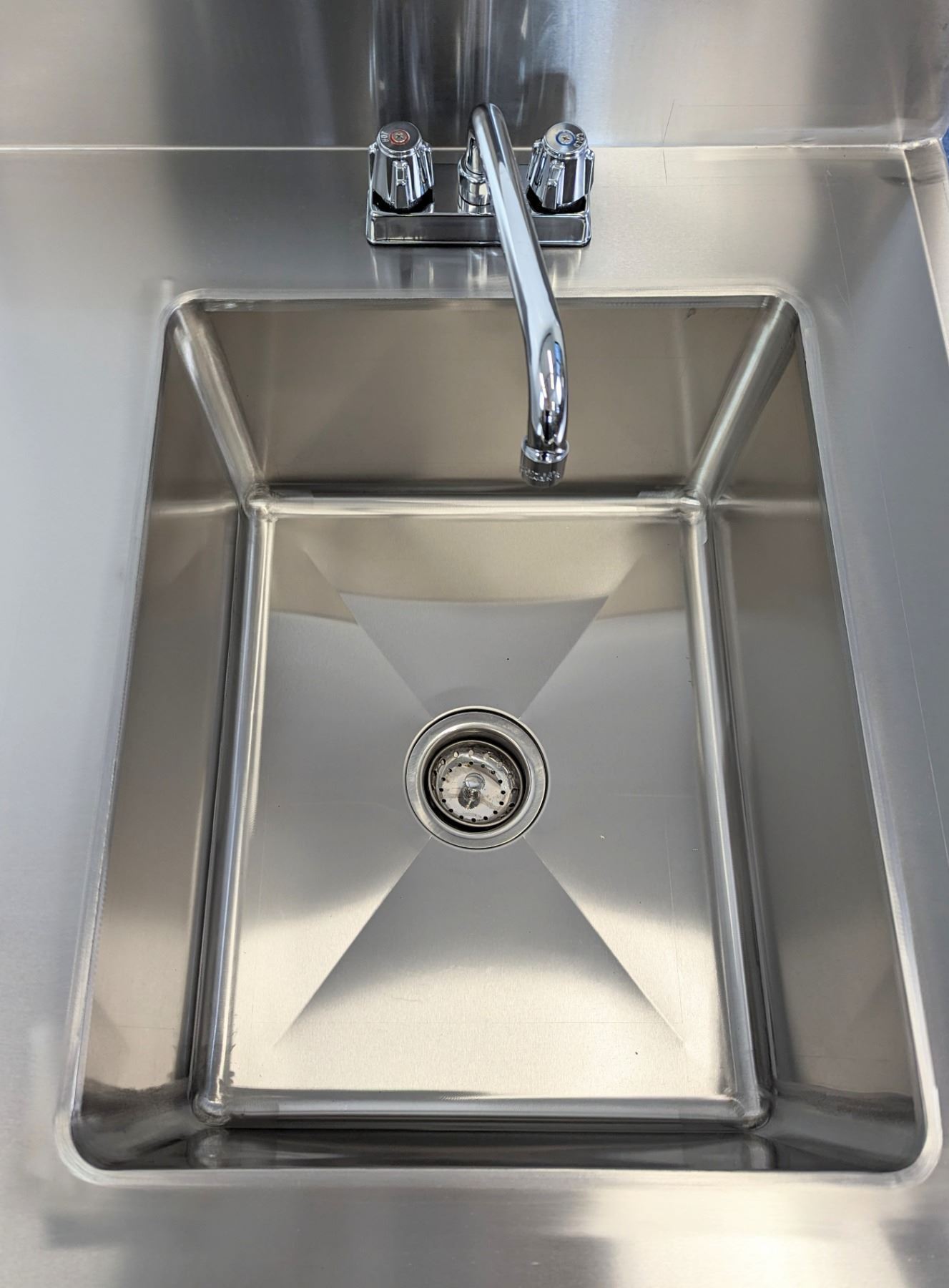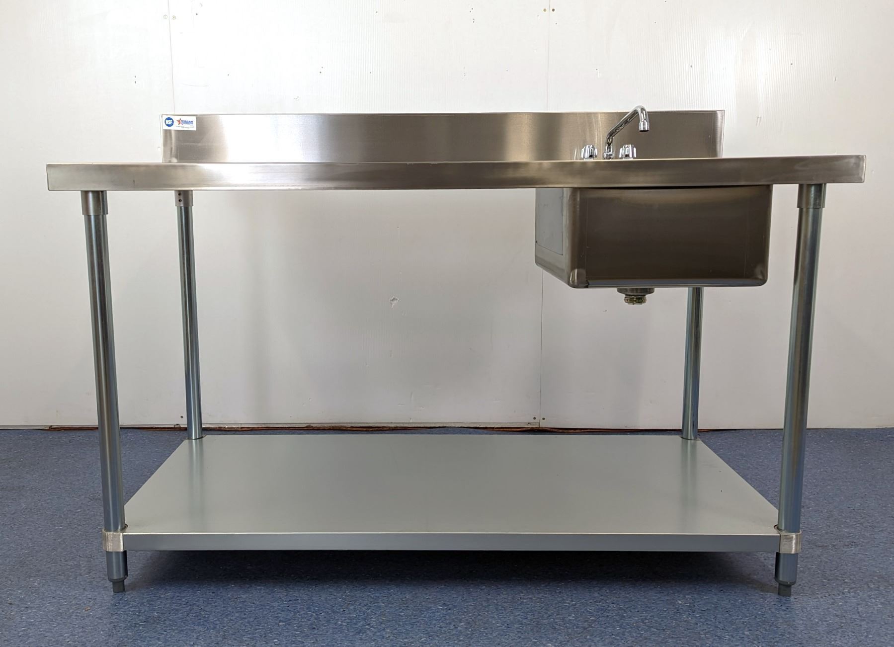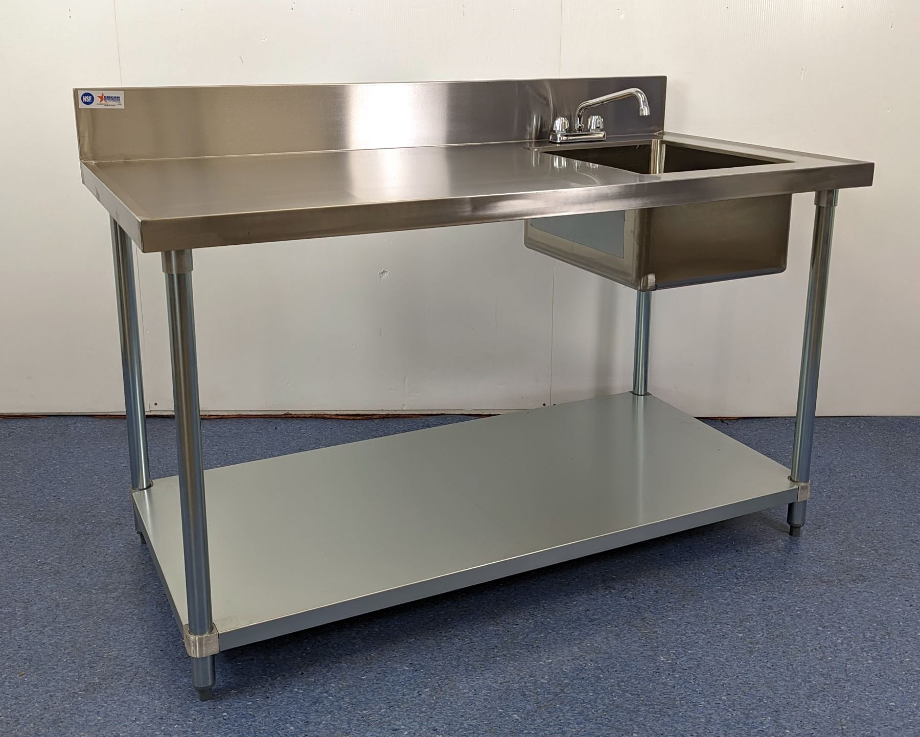 [New in Box,] Includes Faucet, Sink Dimensions 16” x 20” x 10”, 18 Gauge 430 Stainless Steel, Top Load Capacity: 1150lbs, Undershelf Capacity: 460lbs, Fully Adjustable Undershelf, Plastic Bullet Feet (34" Height Adjustable from 33.5" to 34.5" + 6" Backsplash,) Galvanized Legs