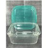 [New In Boxes,] 6" W x6" D x 2.75" H, tempered glass body, 25.7oz, shock resistant, lids included, microwave/freezer/dishwasher safe