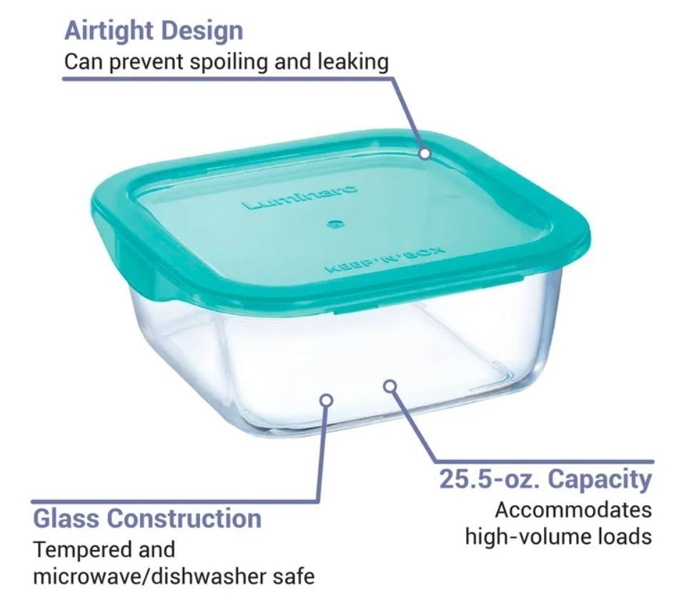 [New In Boxes,] 6" W x6" D x 2.75" H, tempered glass body, 25.7oz, shock resistant, lids included, microwave/freezer/dishwasher safe