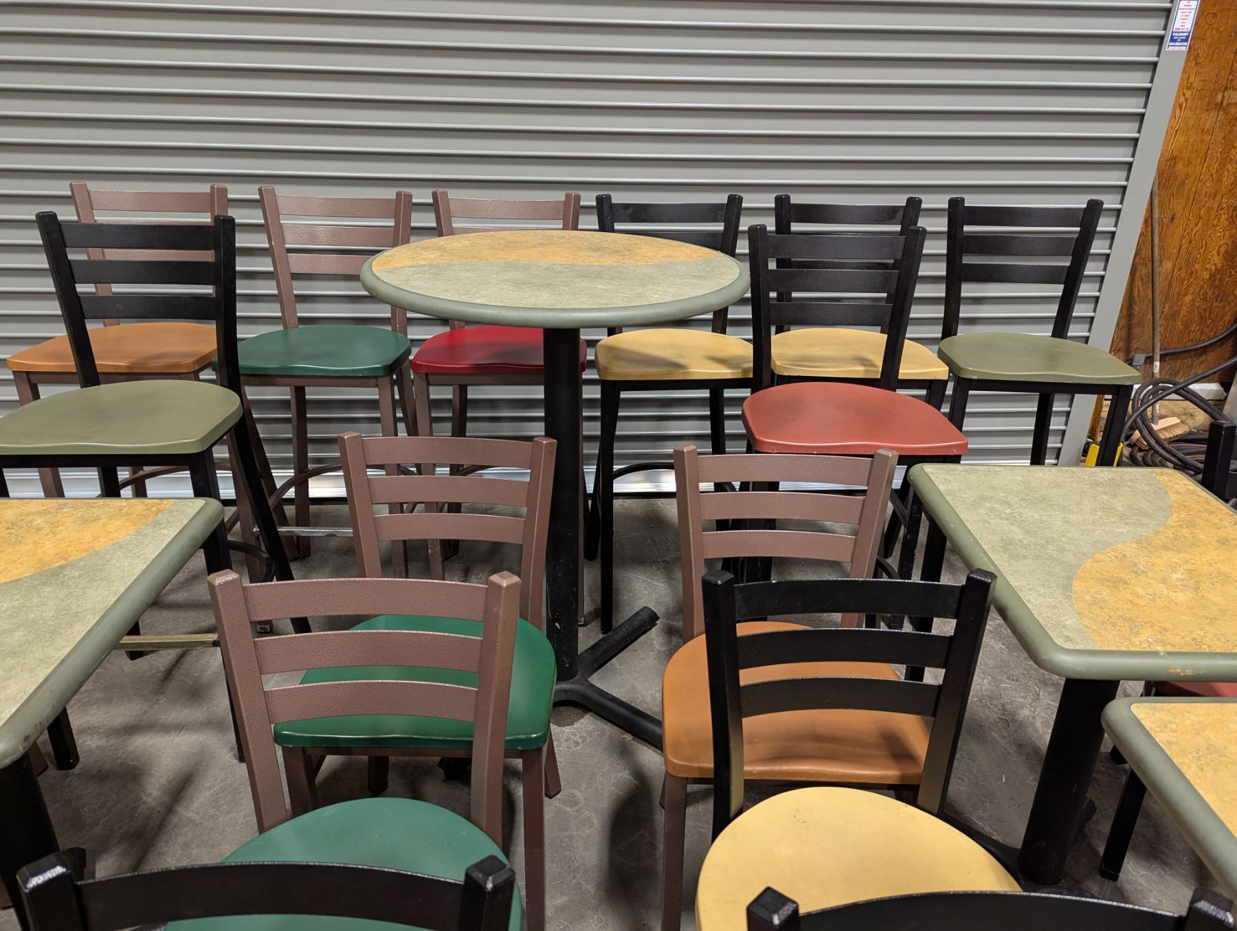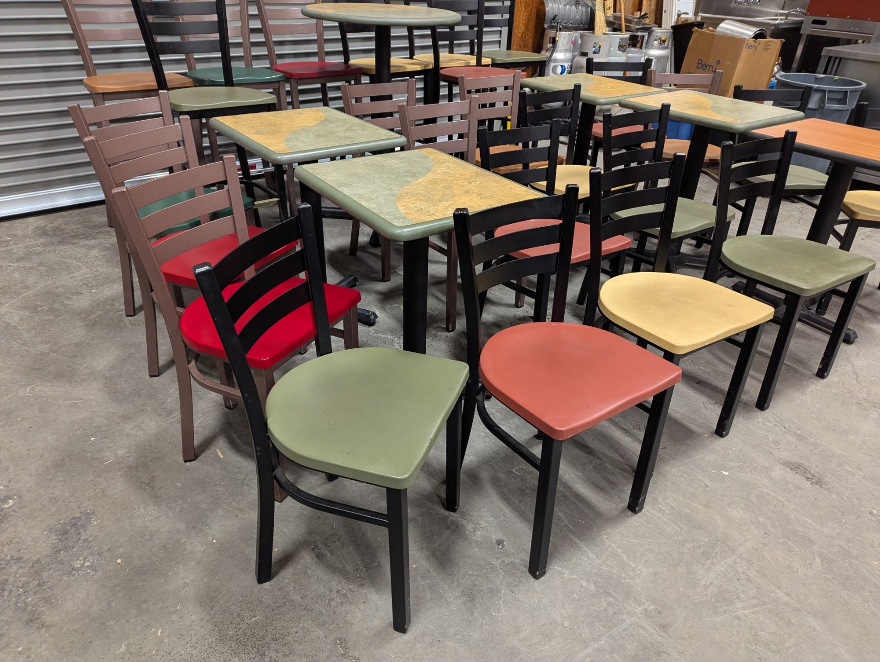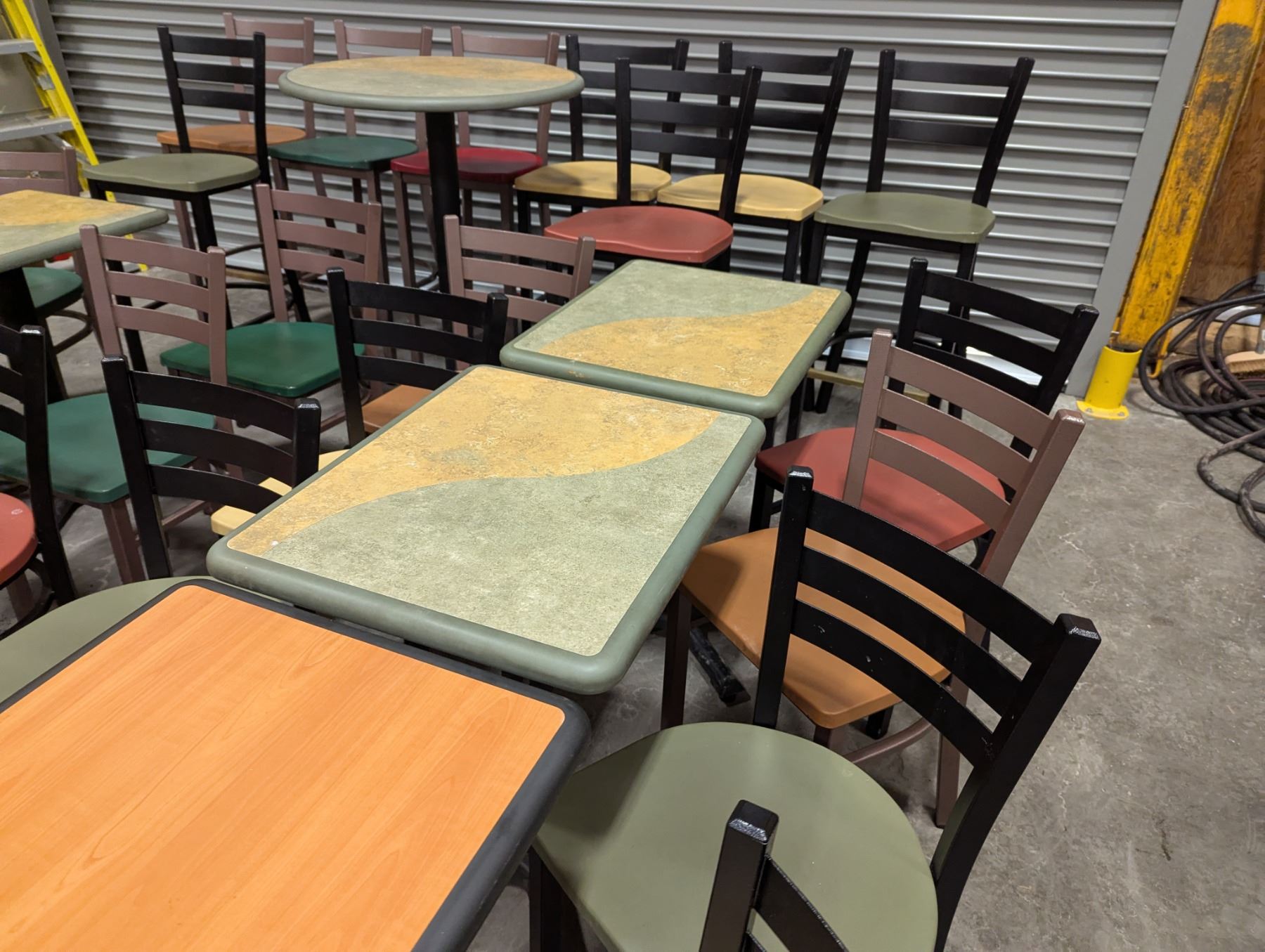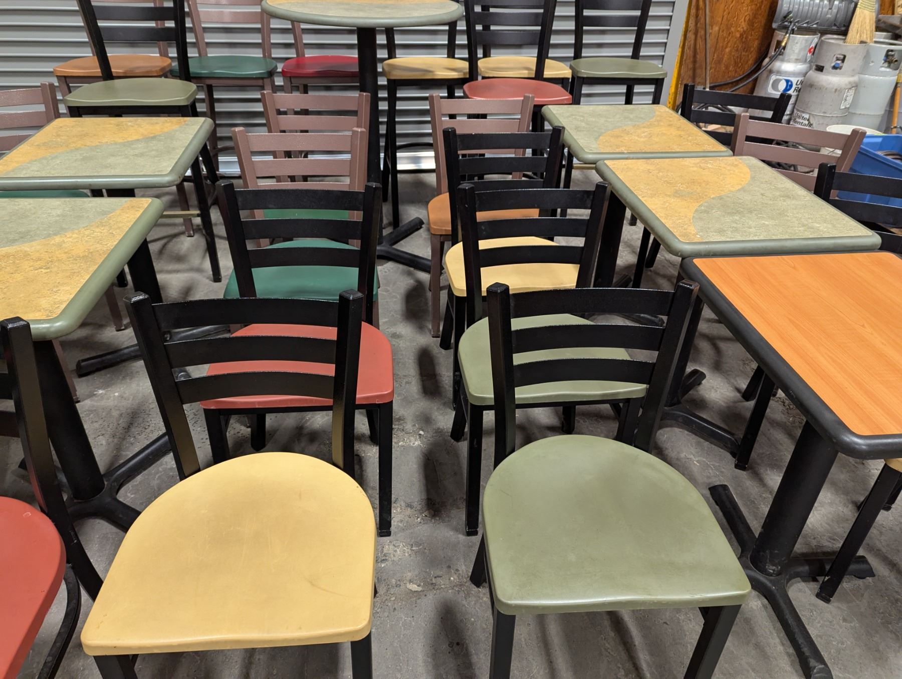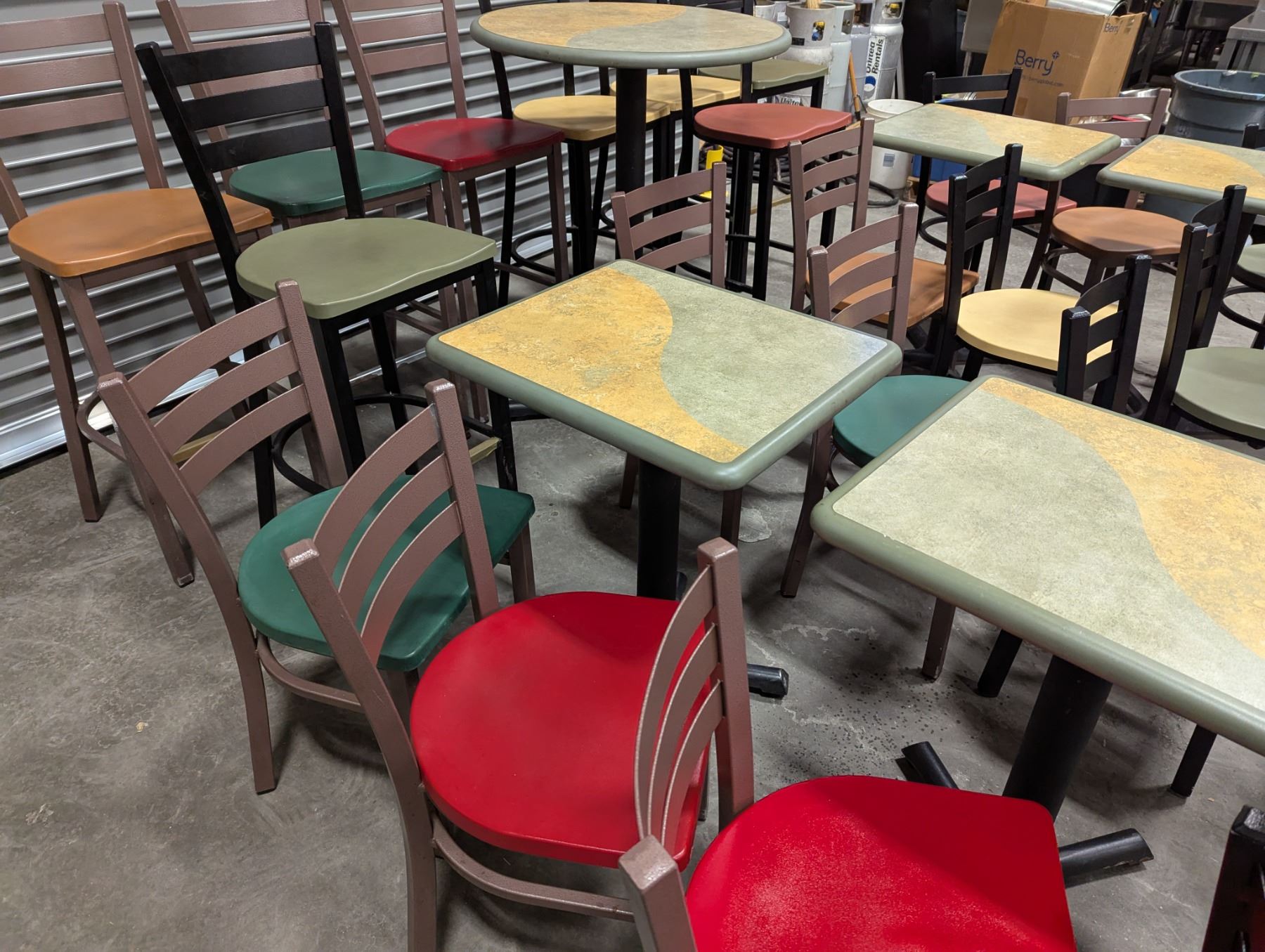 [Used,] Square Table (1pc): 24" x 20" x 29-1/7", Square Table Top (4pcs): 24" x 20" , 2-Colore Square Table(4ps): 24" x 20" x 30-1/4", Bar Table (1pc): 29-1/2" Dia, 42"H, Chair (17pcs): Floor to seat 18-1/4", High Chair (8pcs): Floor to seat 29-3/4"