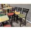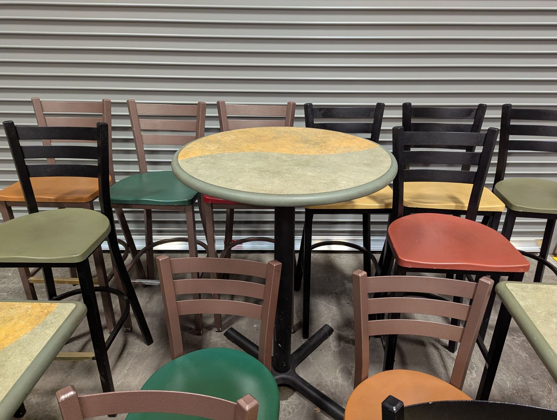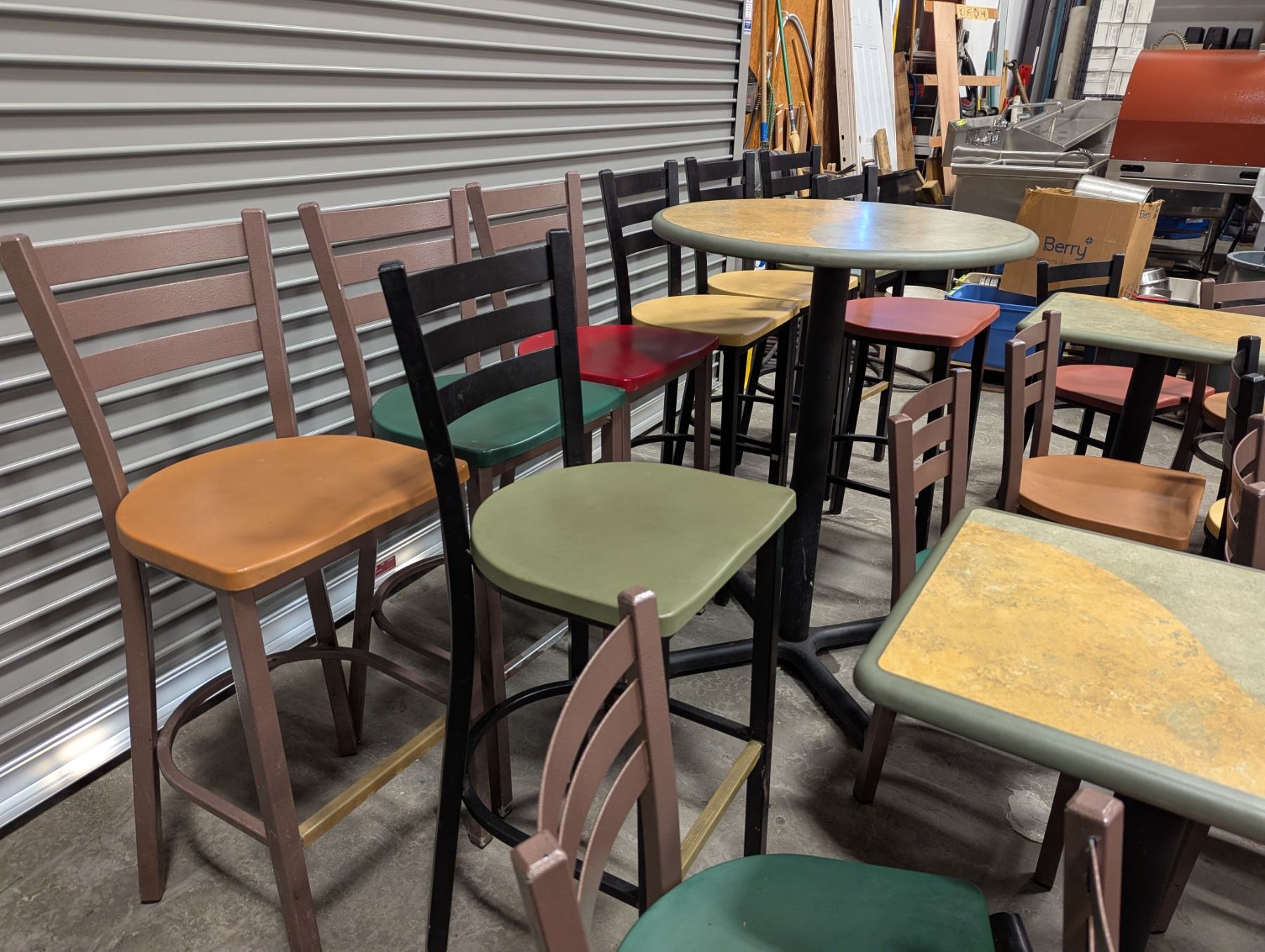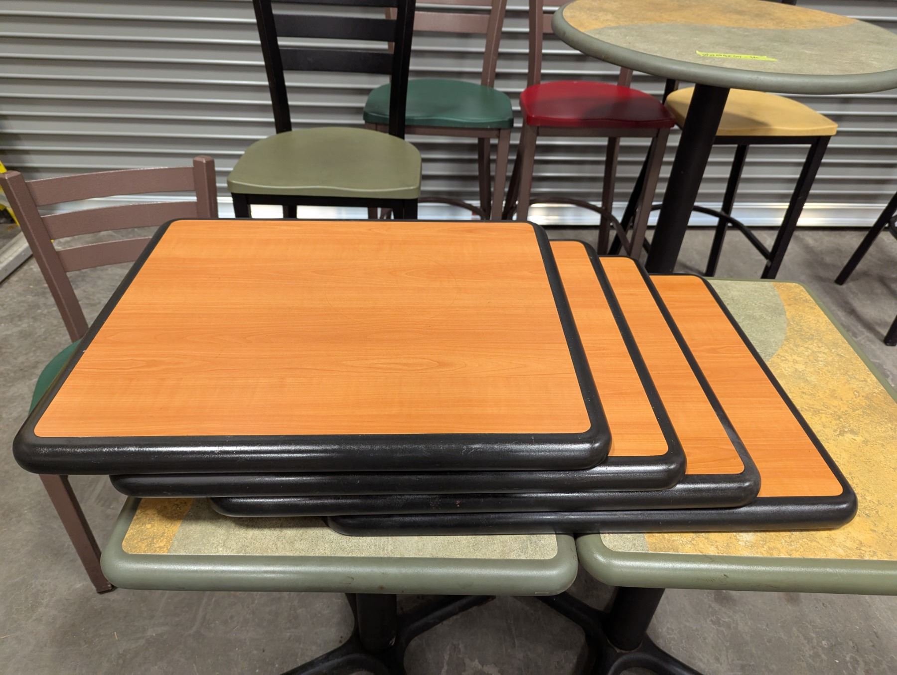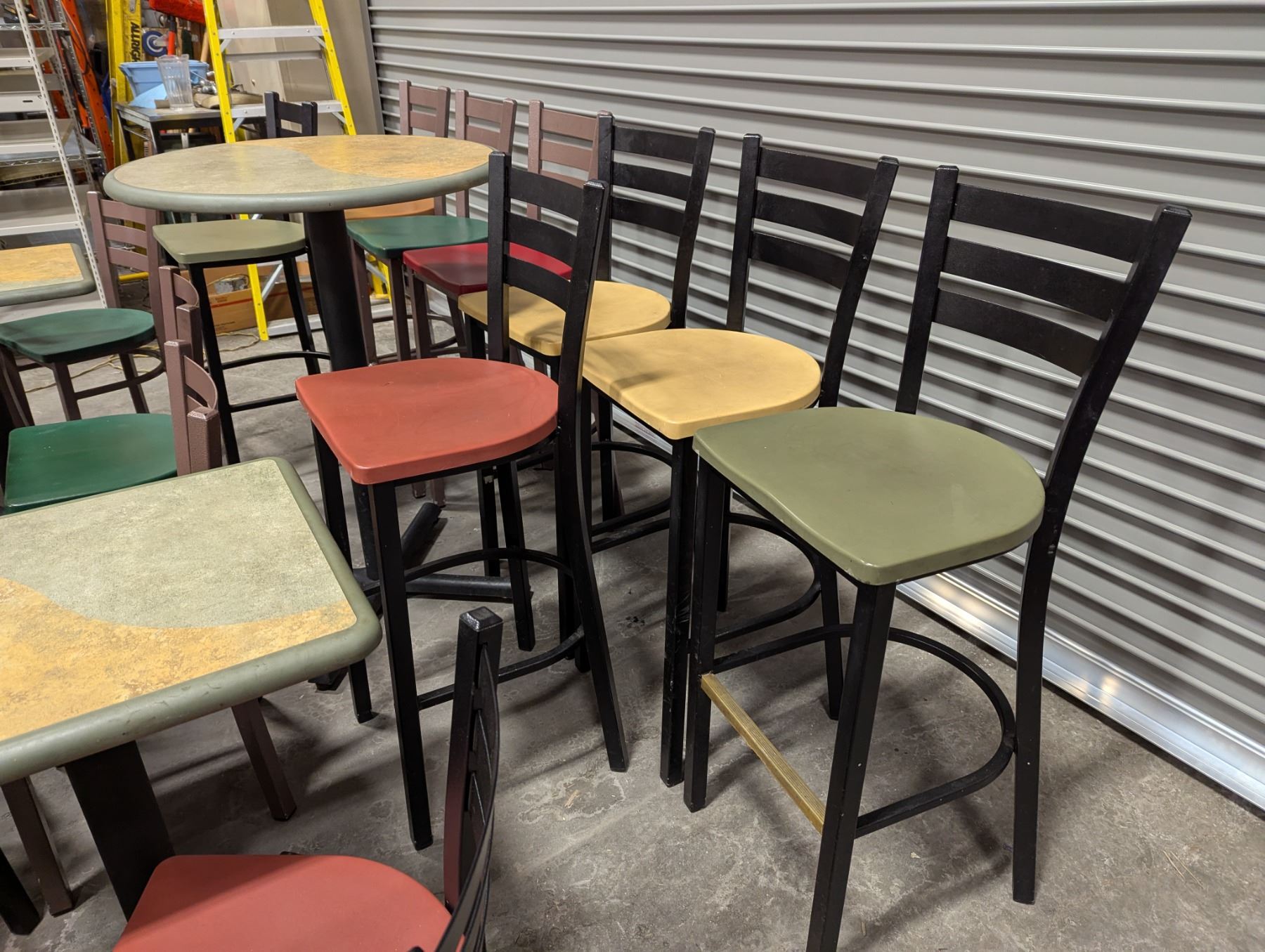 [Used,] Square Table (1pc): 24" x 20" x 29-1/7", Square Table Top (4pcs): 24" x 20" , 2-Colore Square Table(4ps): 24" x 20" x 30-1/4", Bar Table (1pc): 29-1/2" Dia, 42"H, Chair (17pcs): Floor to seat 18-1/4", High Chair (8pcs): Floor to seat 29-3/4"
