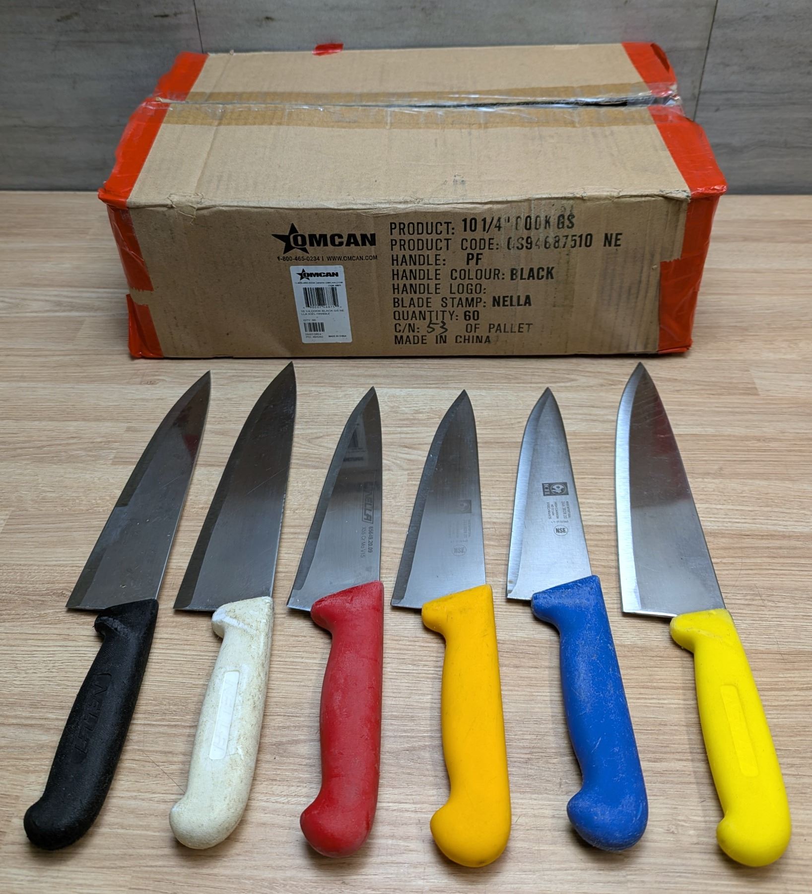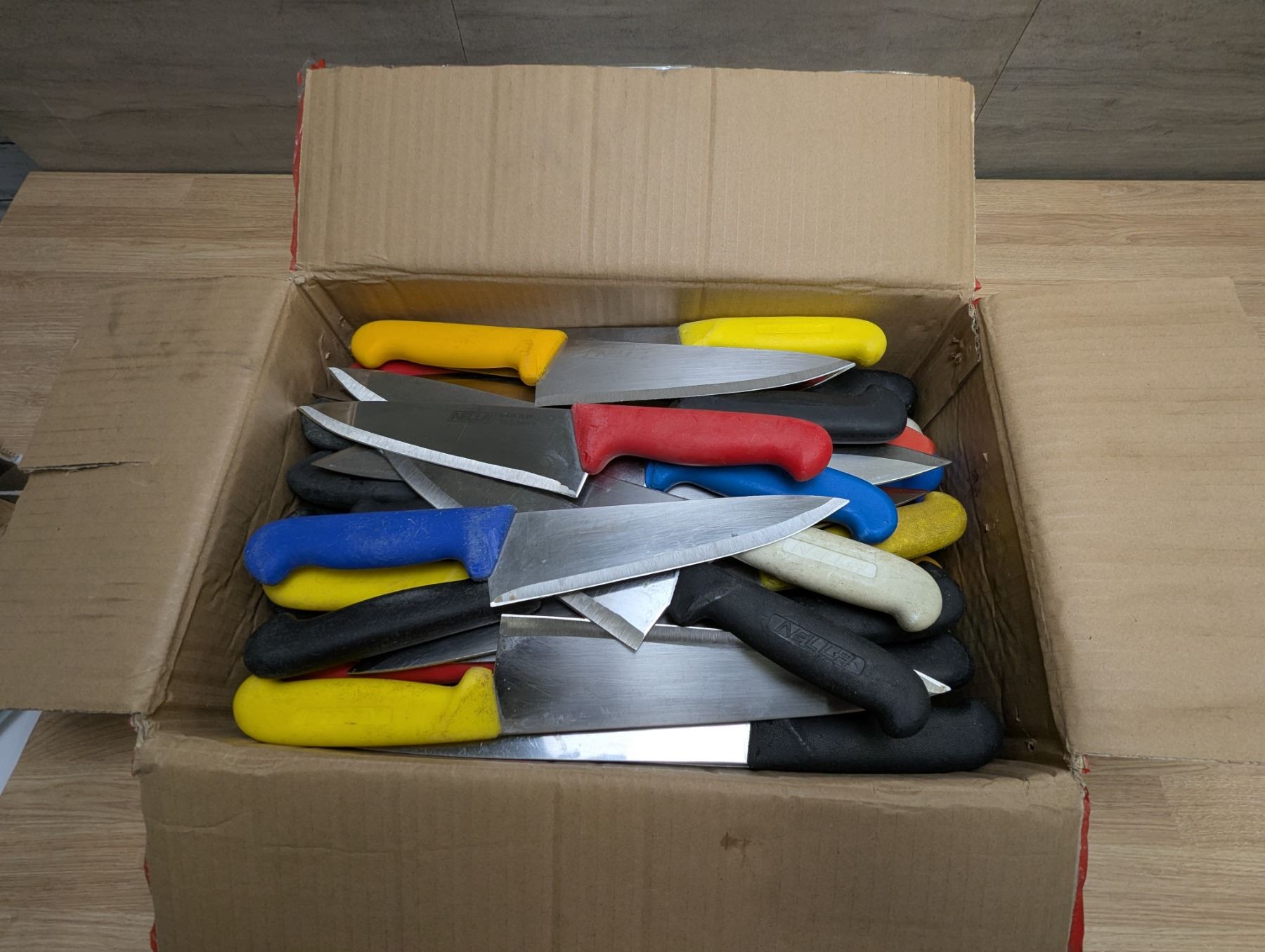 Box of Used, Sharpened Cook Knives - Lot of 60 | Front Knife