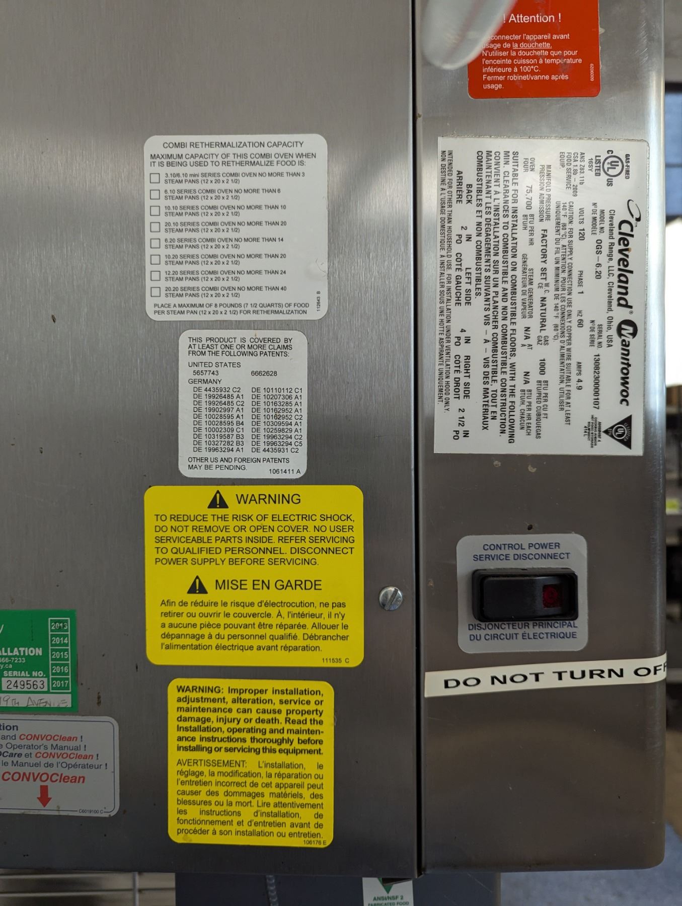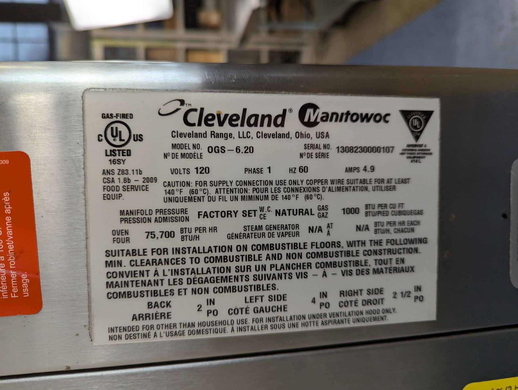 [Used, Tested/Working, No Error Codes,] Serial# 1308230000107, Natural gas, 48" x 41" x 61-1/2" (With stand), 120V/60Hz/1Ph/4.9Amps