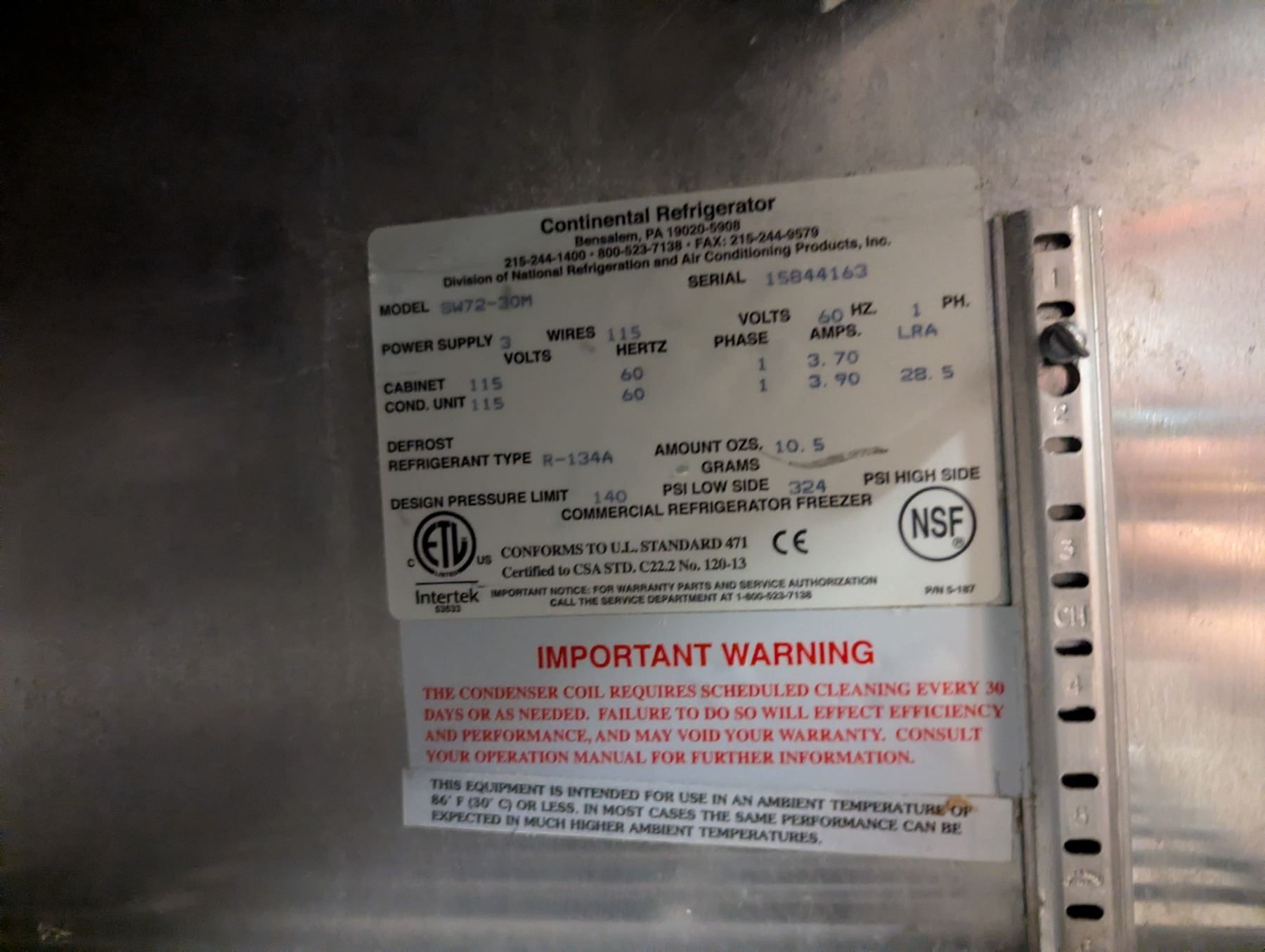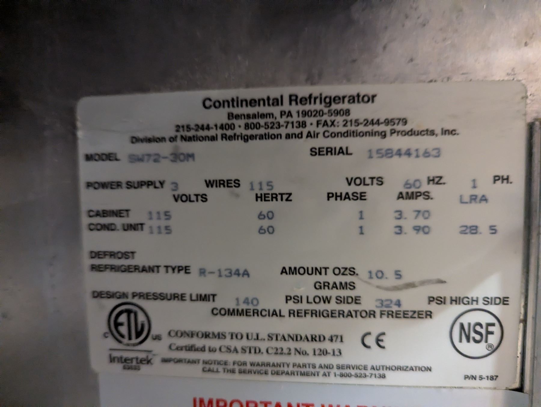 [Used, Tested/Working,] Serial# 15844163, 72" x 35" x 42-1/4", 115V/60Hz/1Ph