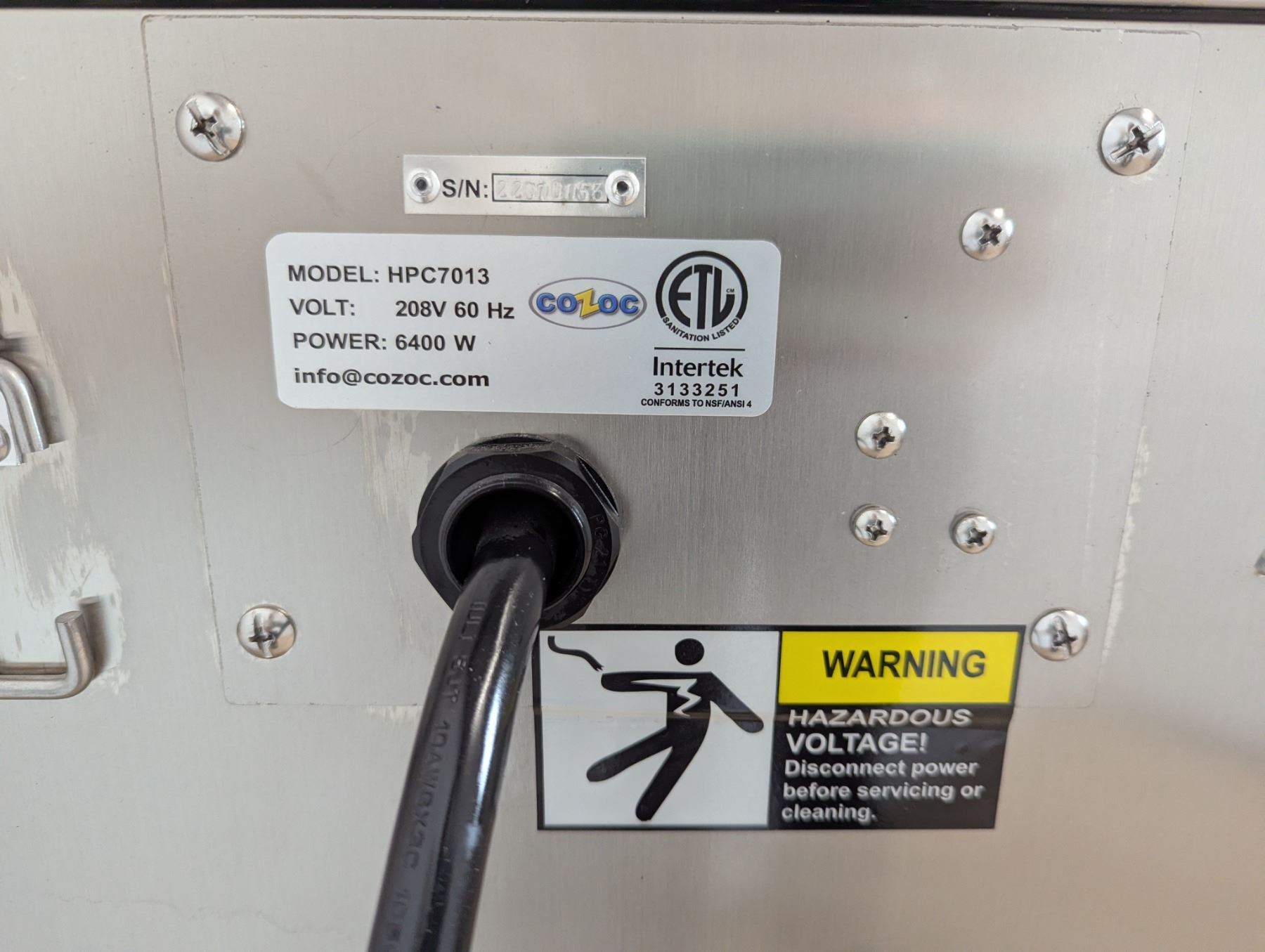 [New,] Serial# 22070053, 25.4" x 31" x 77-1/2", 208V/60Hz/6400Watts, Capacity: up to 30 full-size (18" x 26") sheet pans or 16 full-size (12" x 20" x 2-1/2") hotel pans