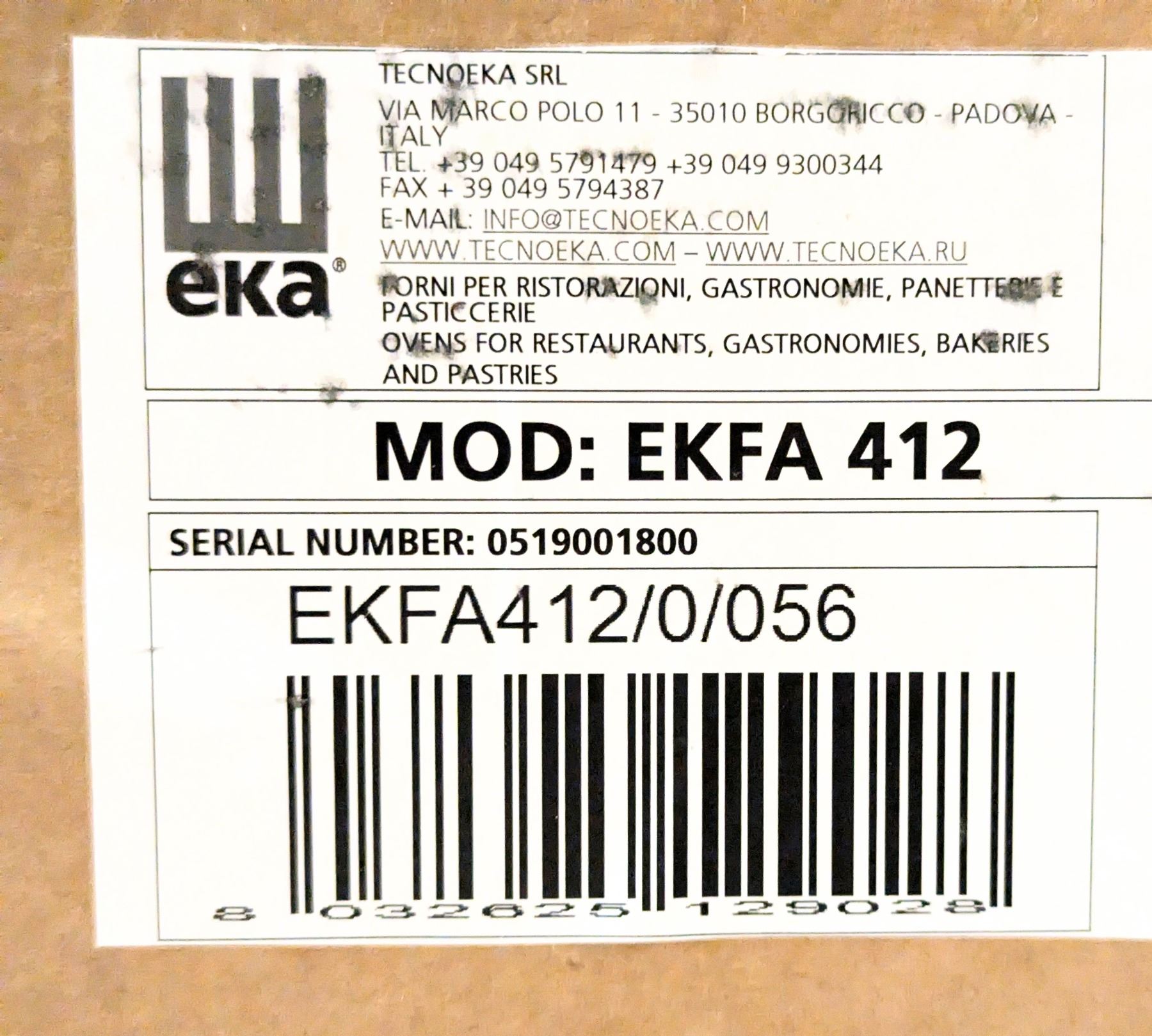 [New In Box,] Serial# 0519001800 , Model: EKFA-412, 110-120V/60HZ/1PH, Overall Dims (WxDxH) 24"x28"x26", Weight 94lbs, Temp Range, 200-500 (°F), Amps 15