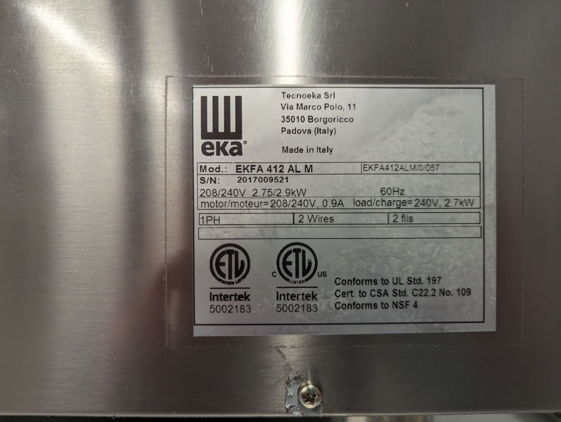 [New In Box,] Serial #0519001814, Model: EKFA-412AL-208-1 - 208-240V/60HZ/1PH, Side Door Opening, with Broil, Overall Dims (WxDxH) 24"x28"x26", Weight 100lbs, Temp Range, 200-500 (°F), Amps 11.5-13