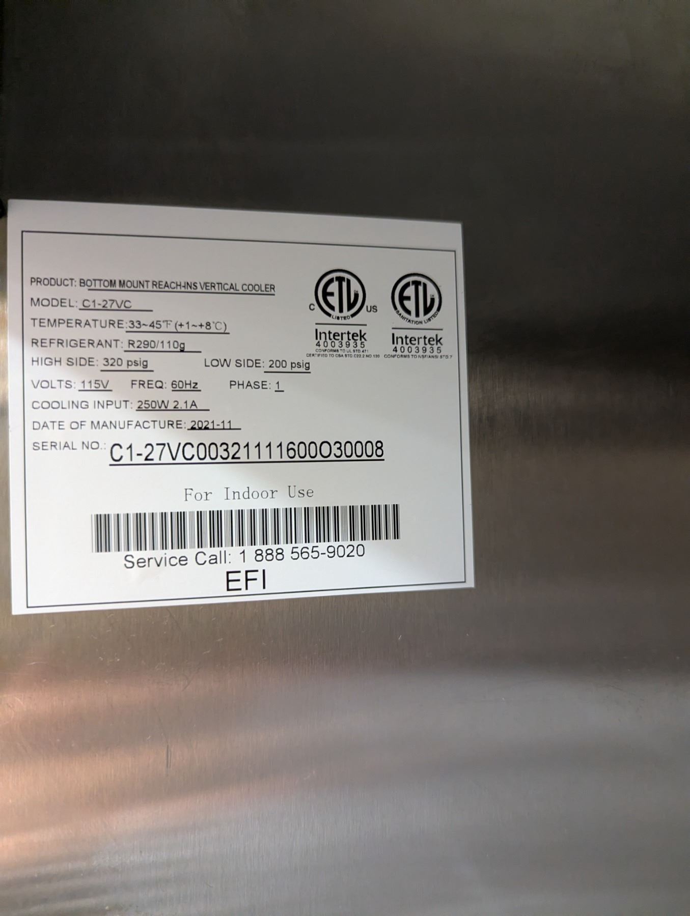Efi C1-27VC 27" Single Door Stainless Cooler