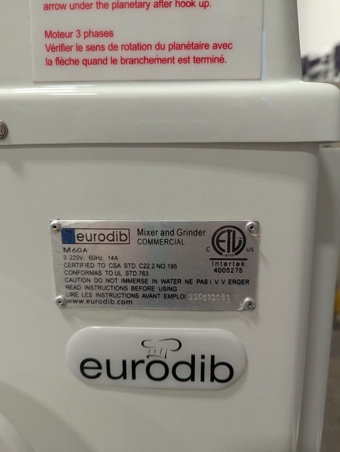 [New,] Serial# 220512061, 220V/60Hz/3Ph, Comes with Whip, Beater & Hook, Bowl Diameter: 20", Net Weight: 1078lbs, Ship Weight: 1285lbs
