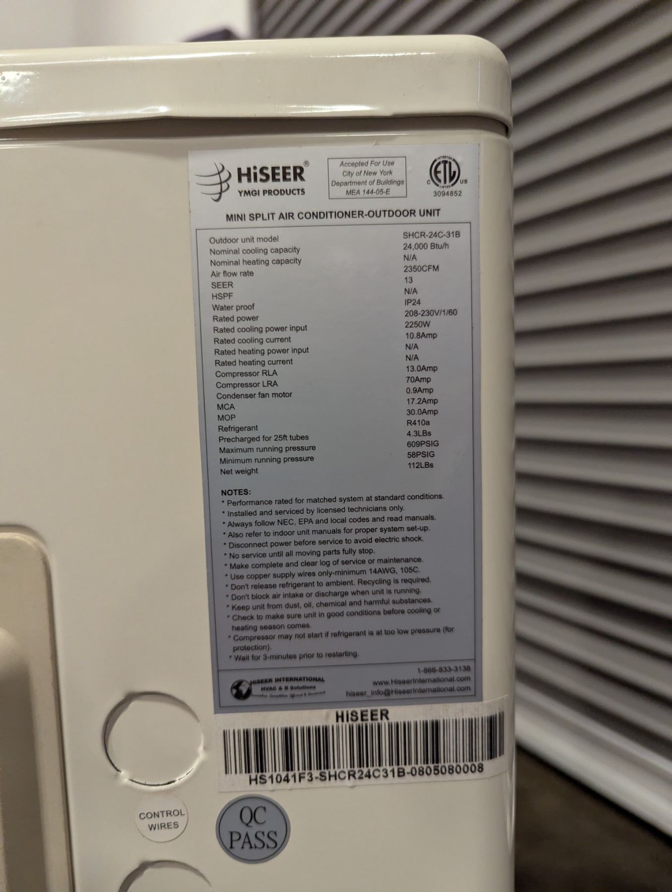 [New,] Model: SHCR-24C-31B Mini Split
