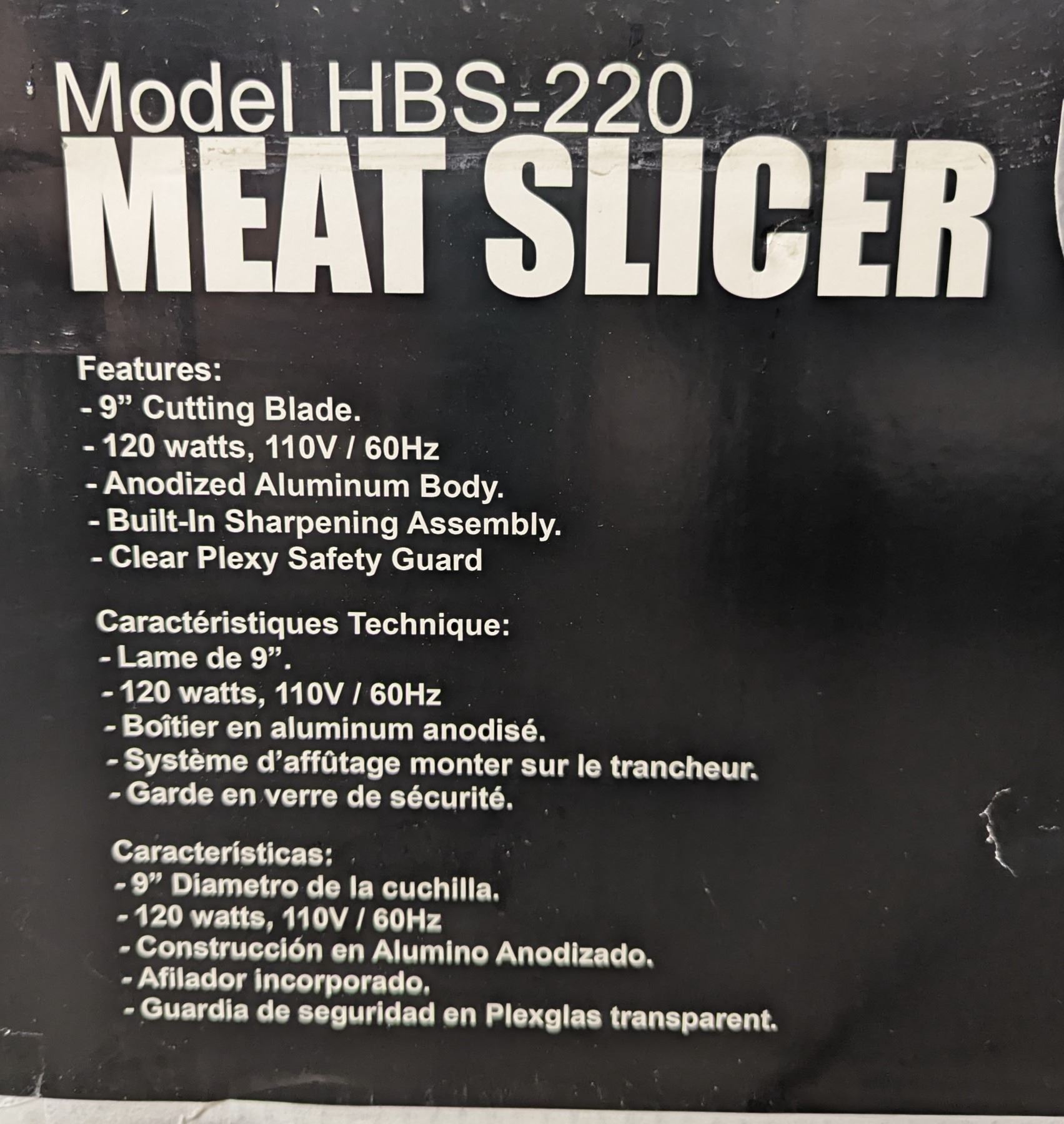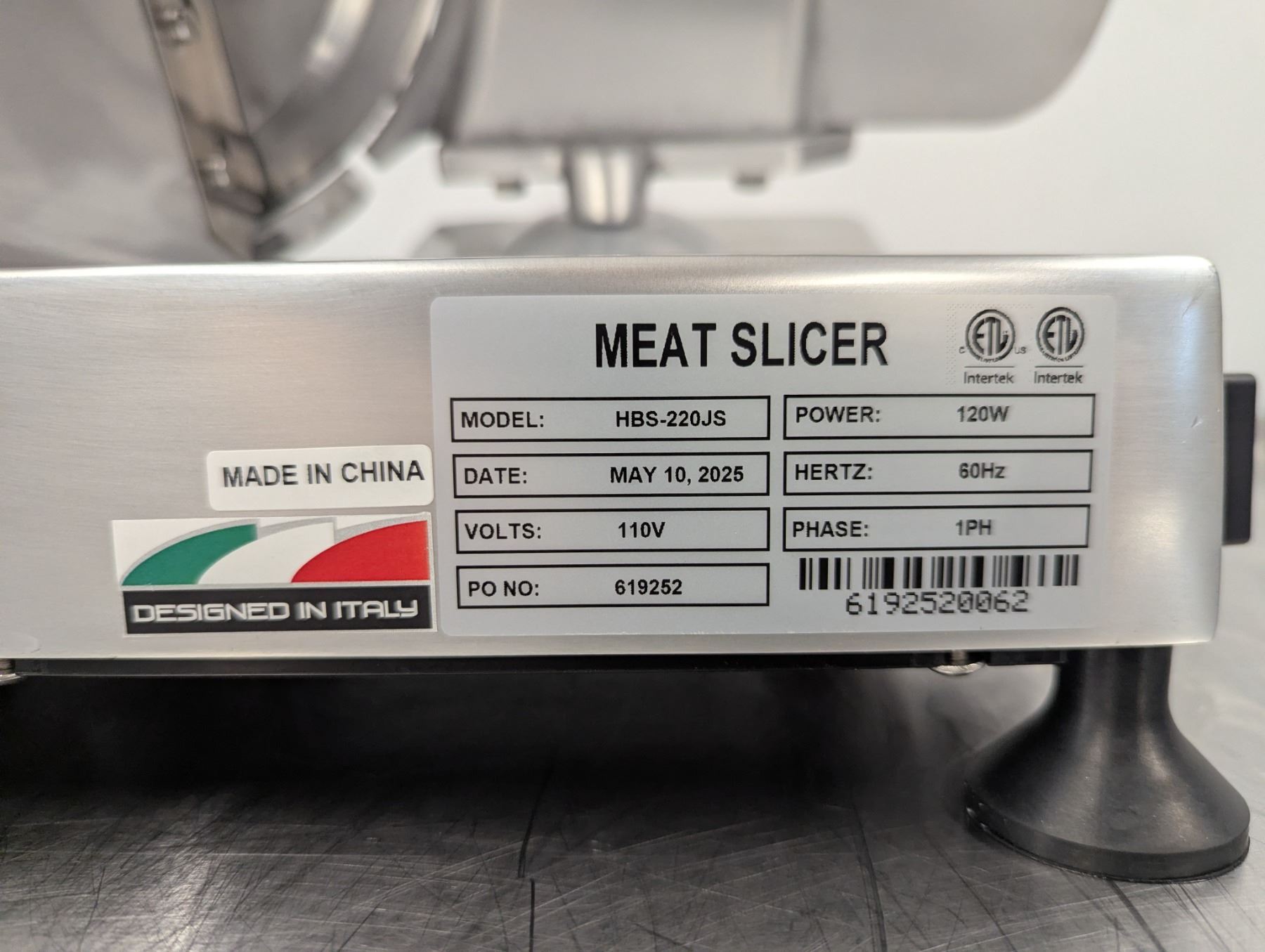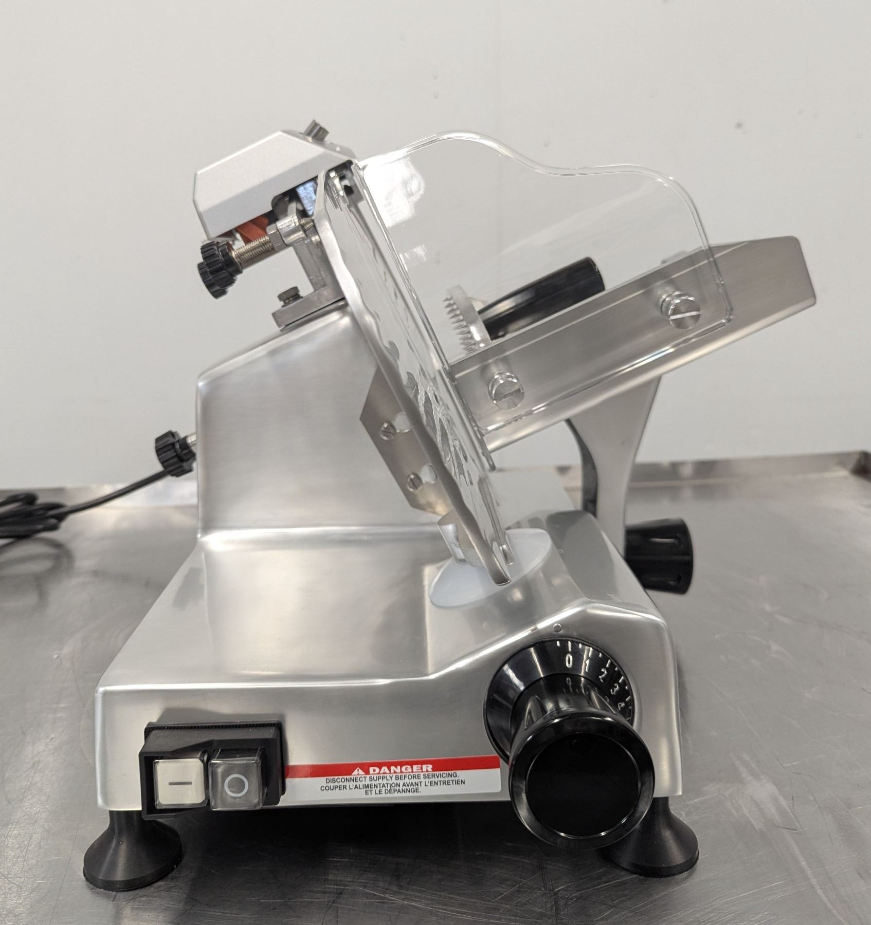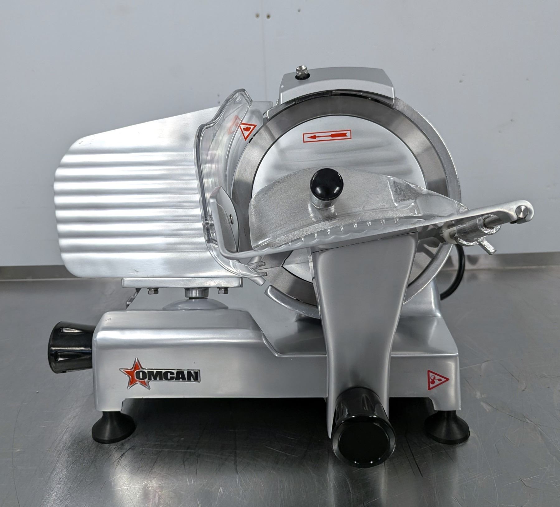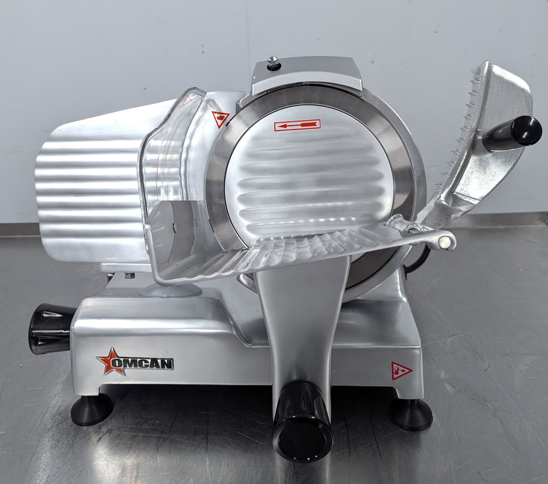 [New In Box,] Mfg May 2025, Serial# 6192520062, Omcan 21629, 110V/60Hz/1Ph, Perspex Protector Guard, Built-in sharpening Assembly, Maximum slicing width: 6.25"