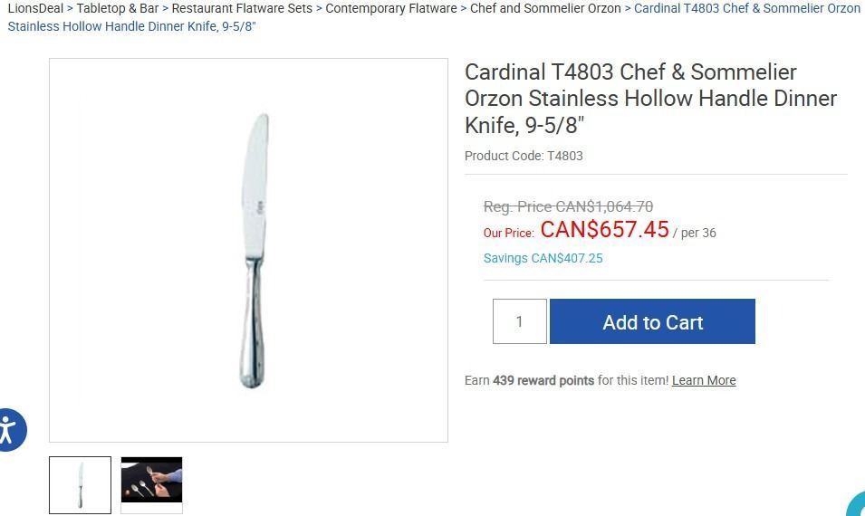 Orzon 9-5/8" Hollow Handle Dinner Knives, Chef & Sommelier T4803 - Lot of 36