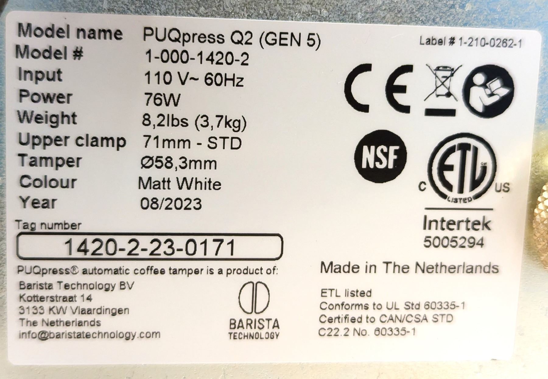 PUQpress Gen 5 Q2 58.3mm Automatic Coffee Tamper, Matt White | FrC