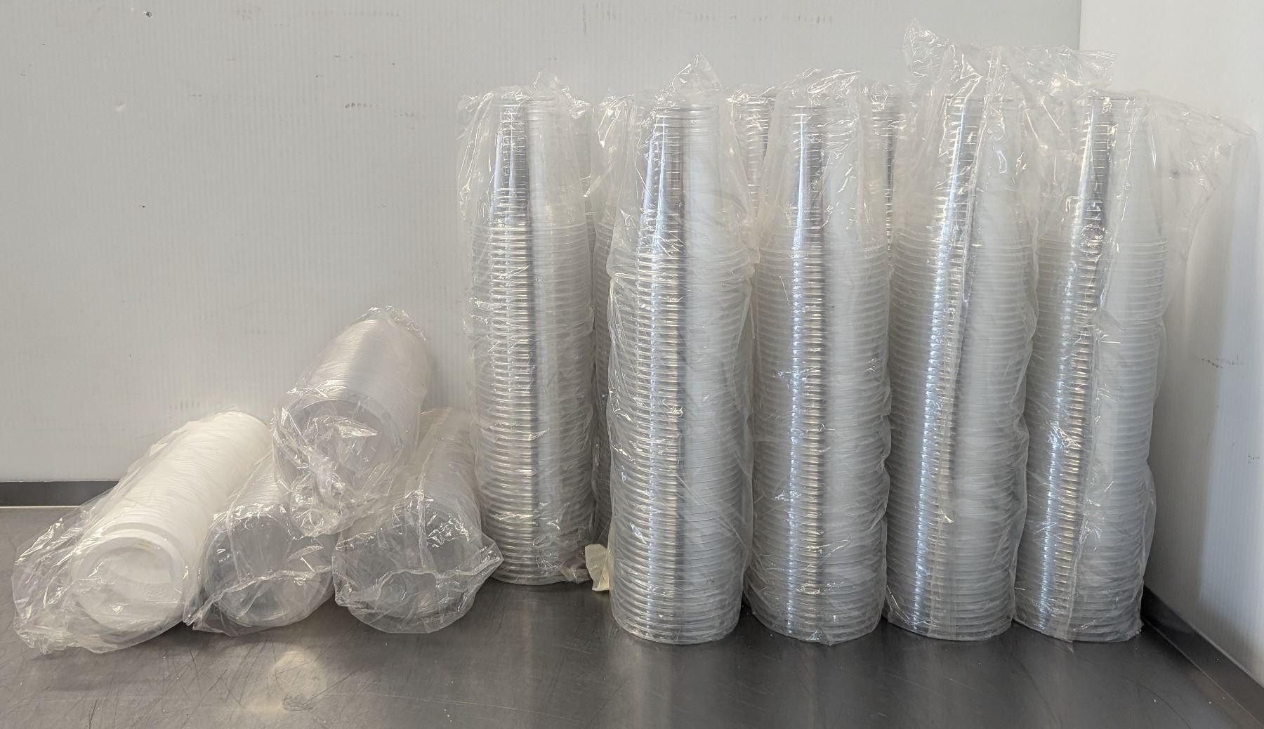[New,] Clear cup x Approx. 700, Sip lid x Approx 150 (fits clear cup), White lid x Approx 50 (Don't fit clear cup)