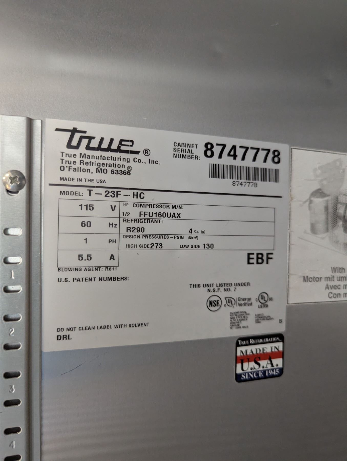 [Used, Tested/Working,] Serial# 8747778, 27" x 29-1/2" x 83-1/2", 115V/60Hz/1Ph
