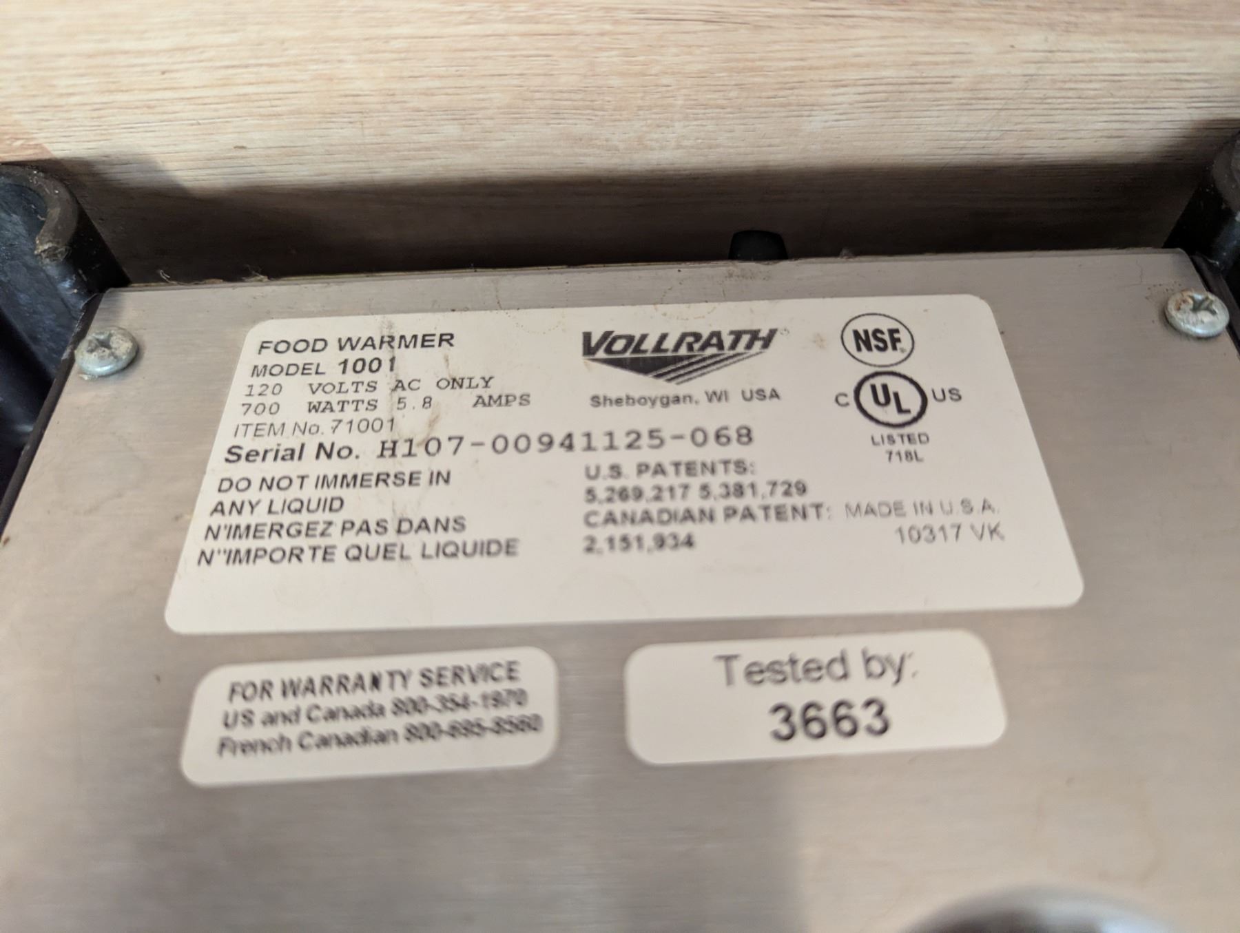 Vollrath 1001 Food Warmer